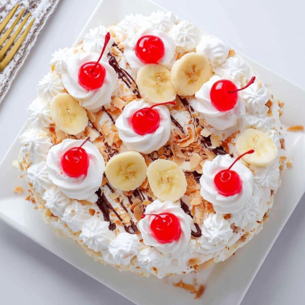 Inspired by the classic banana split sundae, this cake layers graham cracker crust, creamy filling, bananas, pineapple, strawberries, whipped topping, and that iconic cherry-on-top moment. It’s easily customizable—add chocolate chips, drizzle with caramel, or mix in crushed nuts for a personal twist. The best part? It freezes beautifully and can be made ahead, saving you time and effort.