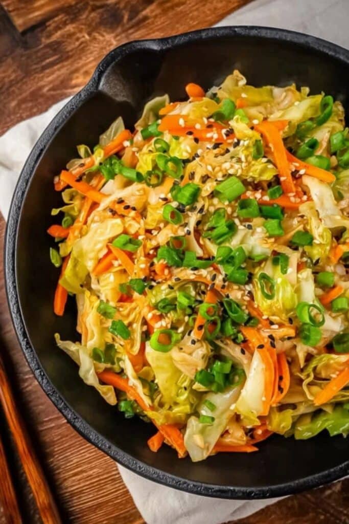 - Egg-and-veggie skillet – Crack 2–3 eggs into a well in the center of the pan once the cabbage is cooked. Scramble them gently, then toss through. It gives the dish a fried-rice vibe without actual rice.
