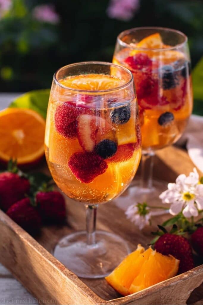 Infuse the fruit just like in the classic recipe—soak your berries, peaches, and citrus in a splash of orange juice or elderflower syrup instead of liqueur. The result is still bubbly, fruity, and festive.