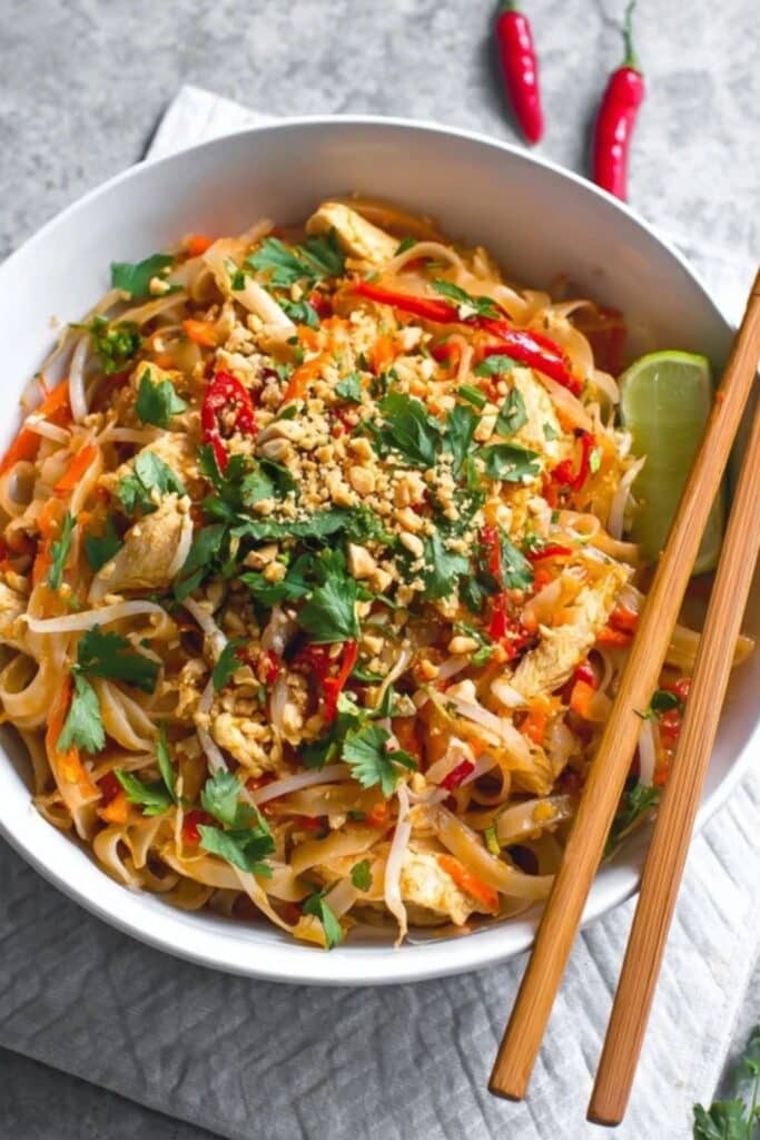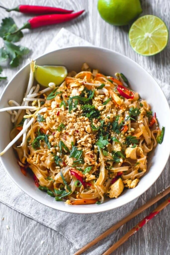 Spicy Chicken Pad Thai deserves a proper presentation. Serve it piping hot with a handful of bean sprouts, chopped peanuts, fresh lime wedges, and cilantro on top.