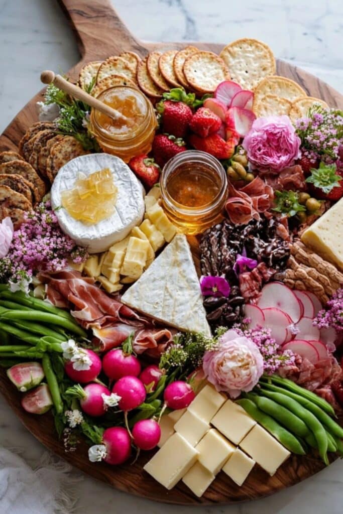 That shift matters because people eat with their eyes first. A board filled with strawberries, radishes, snap peas, cucumber ribbons, goat cheese, and honey instantly looks fresher than one built only around salami and cheddar. So even before anyone takes a bite, the spread already feels seasonal.